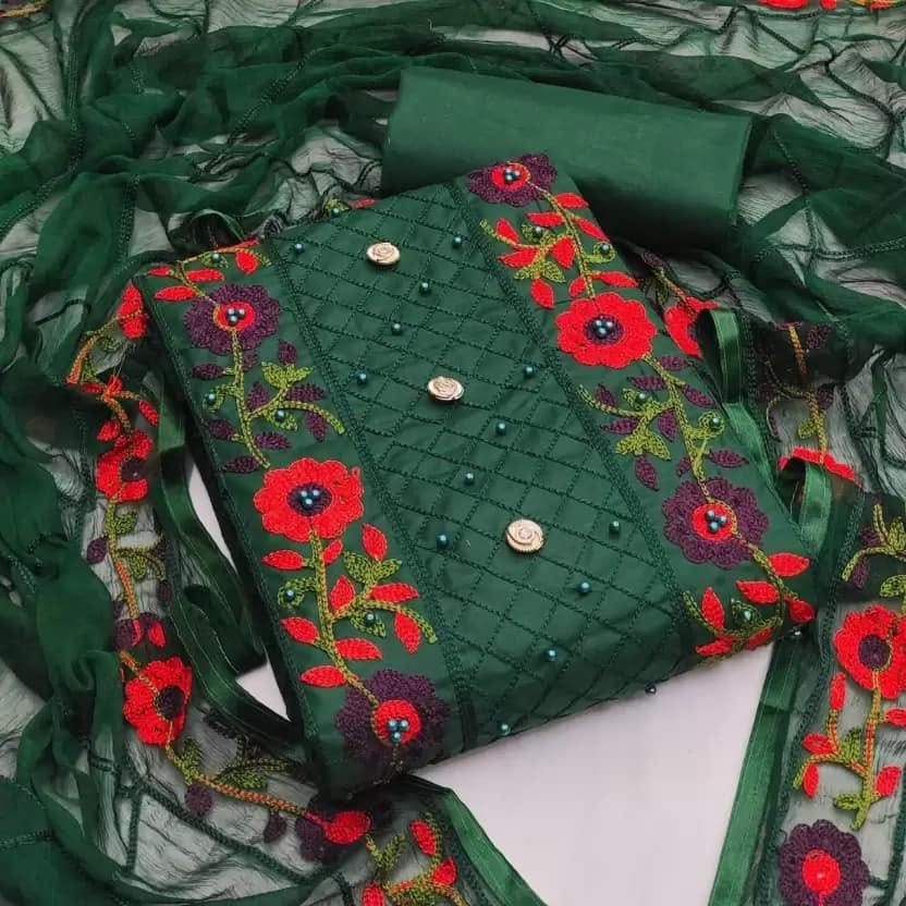 🥰কাশ্মীরী আড়ি এম্ব্রডারী থ্রি-পিচ। ✅জামাঃ সুইচ কটন বুকে সম্পুর্ন বডিতে আড়ি এম্ব্রডারী কাজ করা। ✅জামা লং ৪৫ ইঞ্চি বডি ফ্রী সাইজ সেমি স্টিচ। ✅ওরনাঃ অরবিন্দ কটন স্ক্রিন প্রিন্ট করা। ✅সেলোয়ার সফট বাটার সিল্ক।