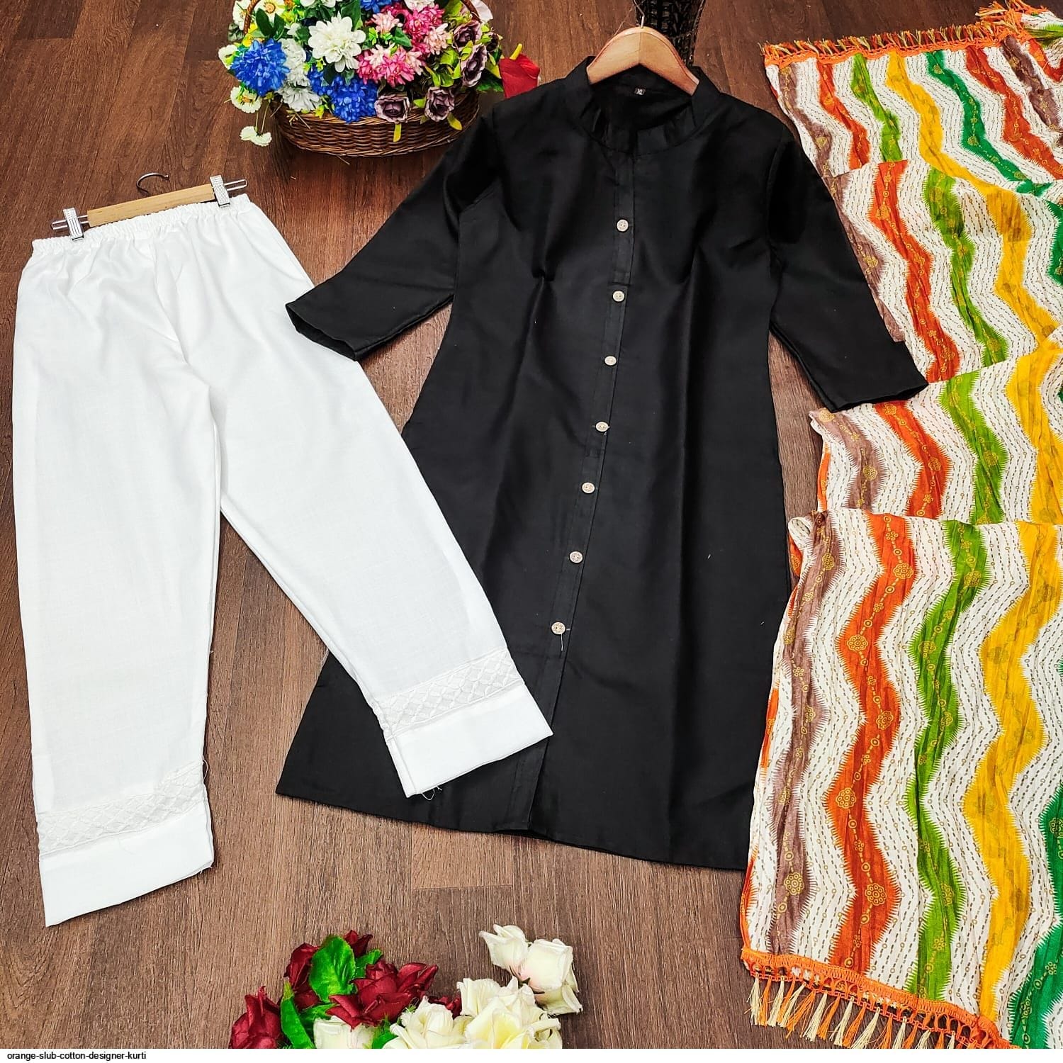 প্যান্টের বিবরণ:-ইন্ডিয়ান বাটার সিল্ক কাপড়ের সম্পূর্ণ সেলাই করা থাকবে প্যান্টের নিচে এমব্রয়ডারি কাজ করা থাকবে।। লং ৩৮,, কোমর ফ্রি সাইজ।