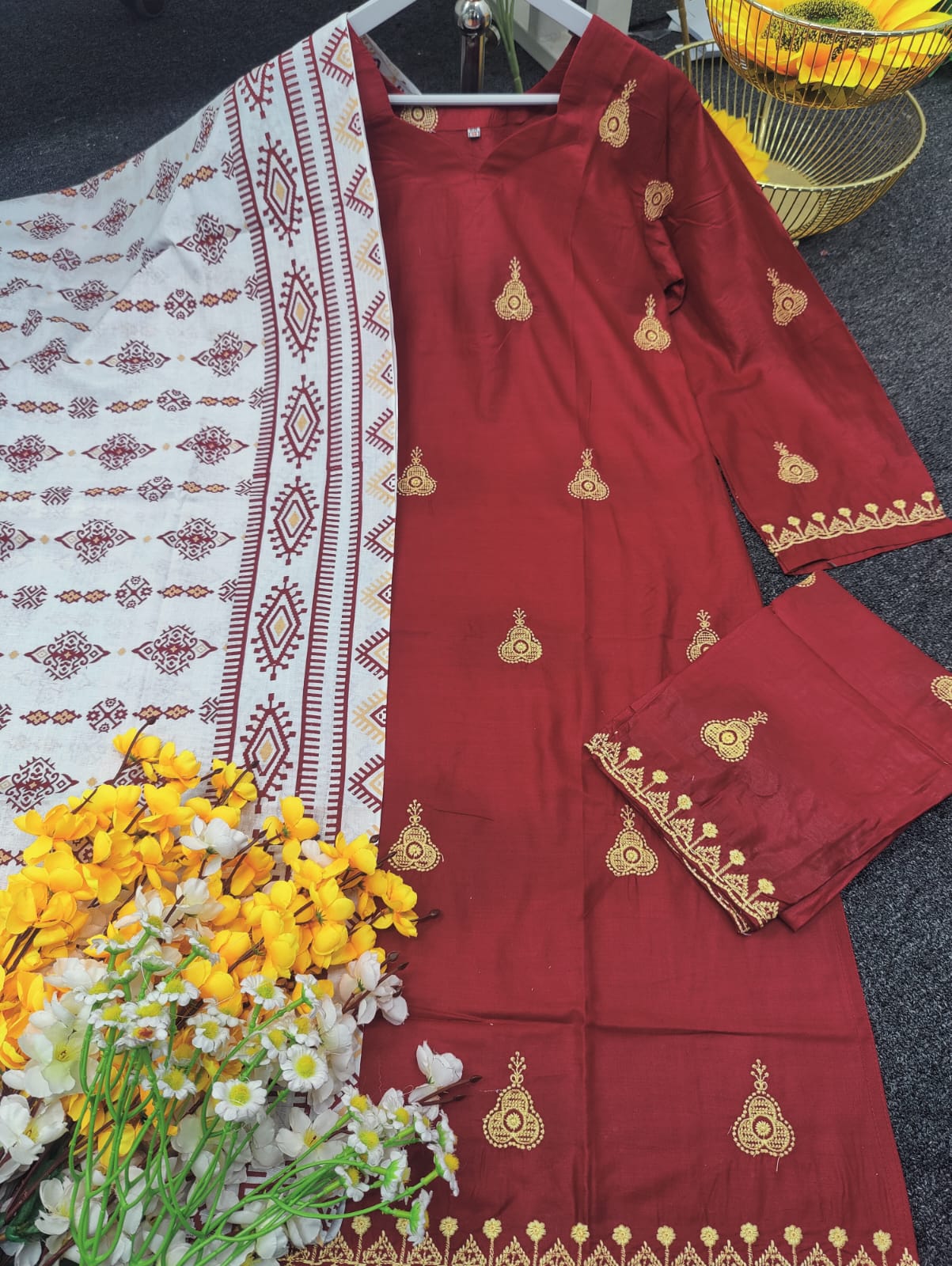 সেলোয়ার:-সেম কাপড়ের উপর এমব্রয়ডারি কাজ করা থাকবে। সাইজ ফ্রি।