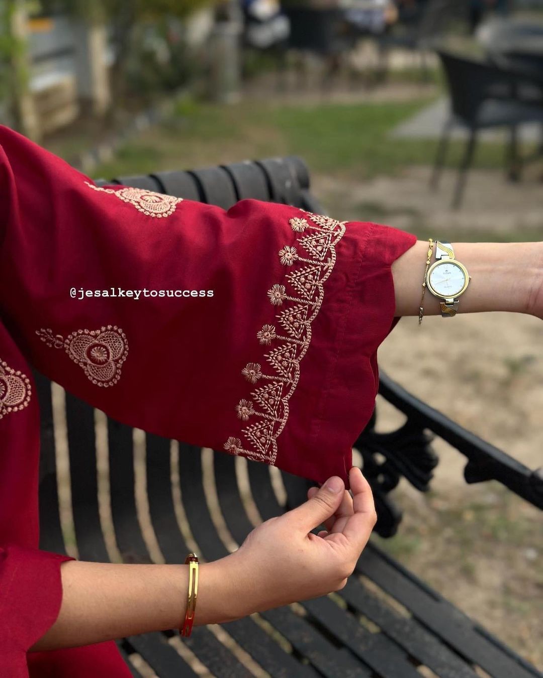 কামিজ:-এসি কটন কাপড়ের উপর সম্পূর্ণ বডিতে ঝুমকা ডিজাইনের এমব্রয়ডারি কাজ করা থাকবে এবং কি জামার নিচে হাতায় সুন্দর করে এমব্রয়ডারি কাজ করা থাকবে। লং ৪৪ ইঞ্চি