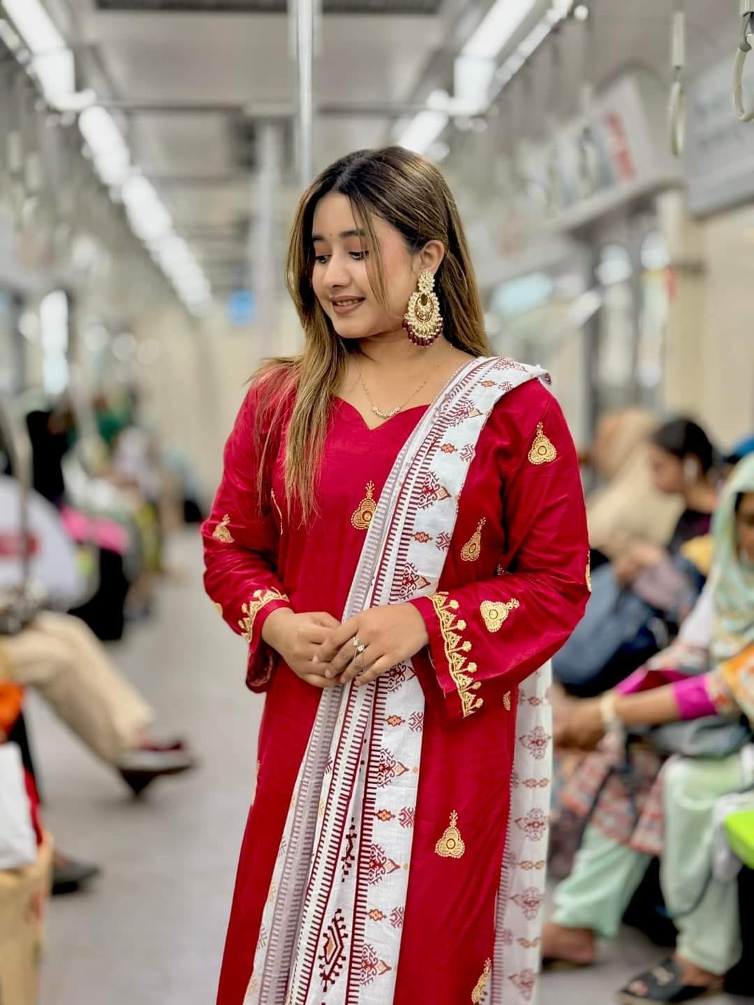 কামিজ:-এসি কটন কাপড়ের উপর সম্পূর্ণ বডিতে ঝুমকা ডিজাইনের এমব্রয়ডারি কাজ করা থাকবে এবং কি জামার নিচে হাতায় সুন্দর করে এমব্রয়ডারি কাজ করা থাকবে। লং ৪৪ ইঞ্চি