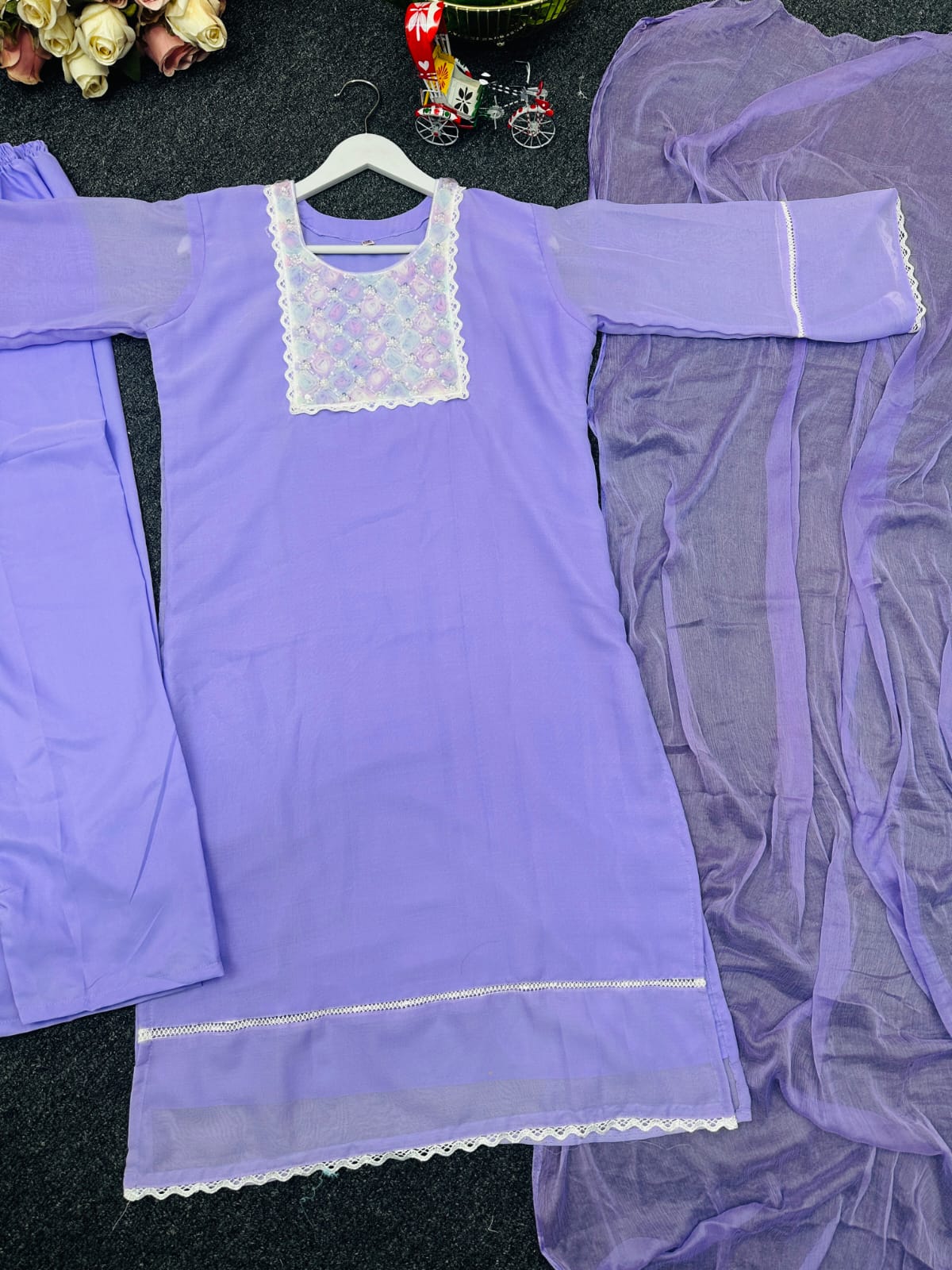 জামার বিবরণ:-পিউর জর্জেট কাপড়ের উপর কারচুপি এবং চায়না লেসের কাজ করা থাকবে।।