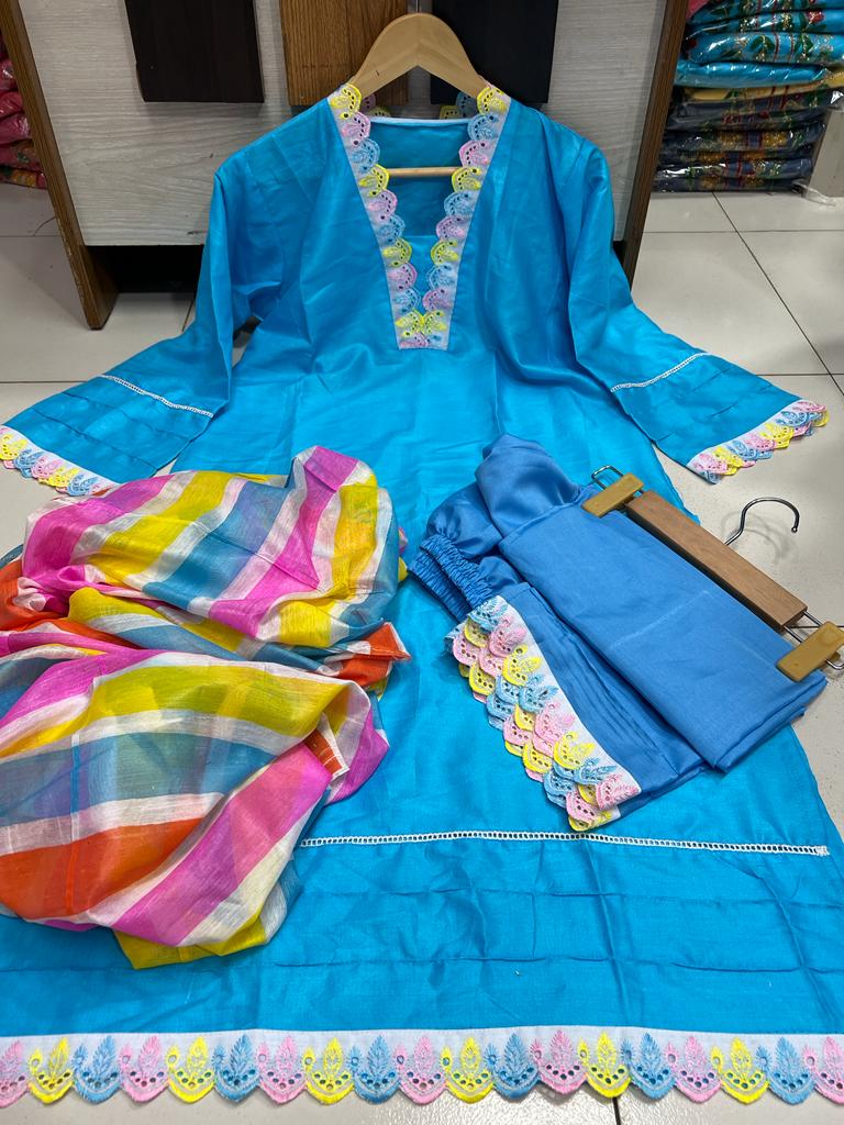 সেলোয়ার:-ইন্ডিয়ান বাটার সিল্ক।। সেলাই করা থাকবে, ফ্রি সাইজ।। সালোয়ারের নিচে এমব্রয়ডারি লেসের কাজ করা থাকবে।।