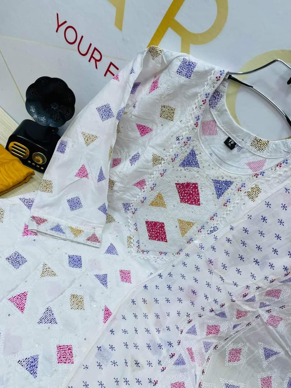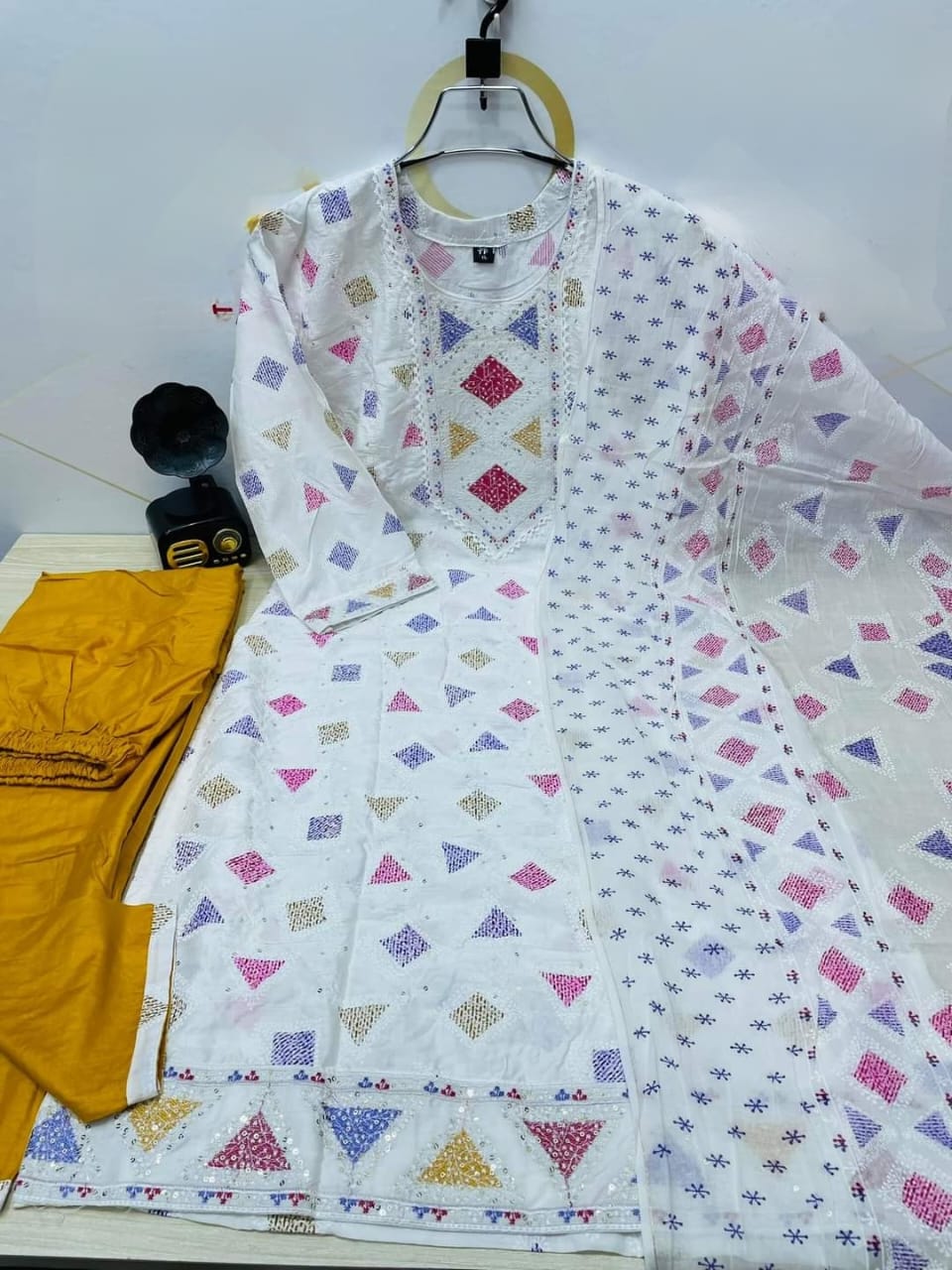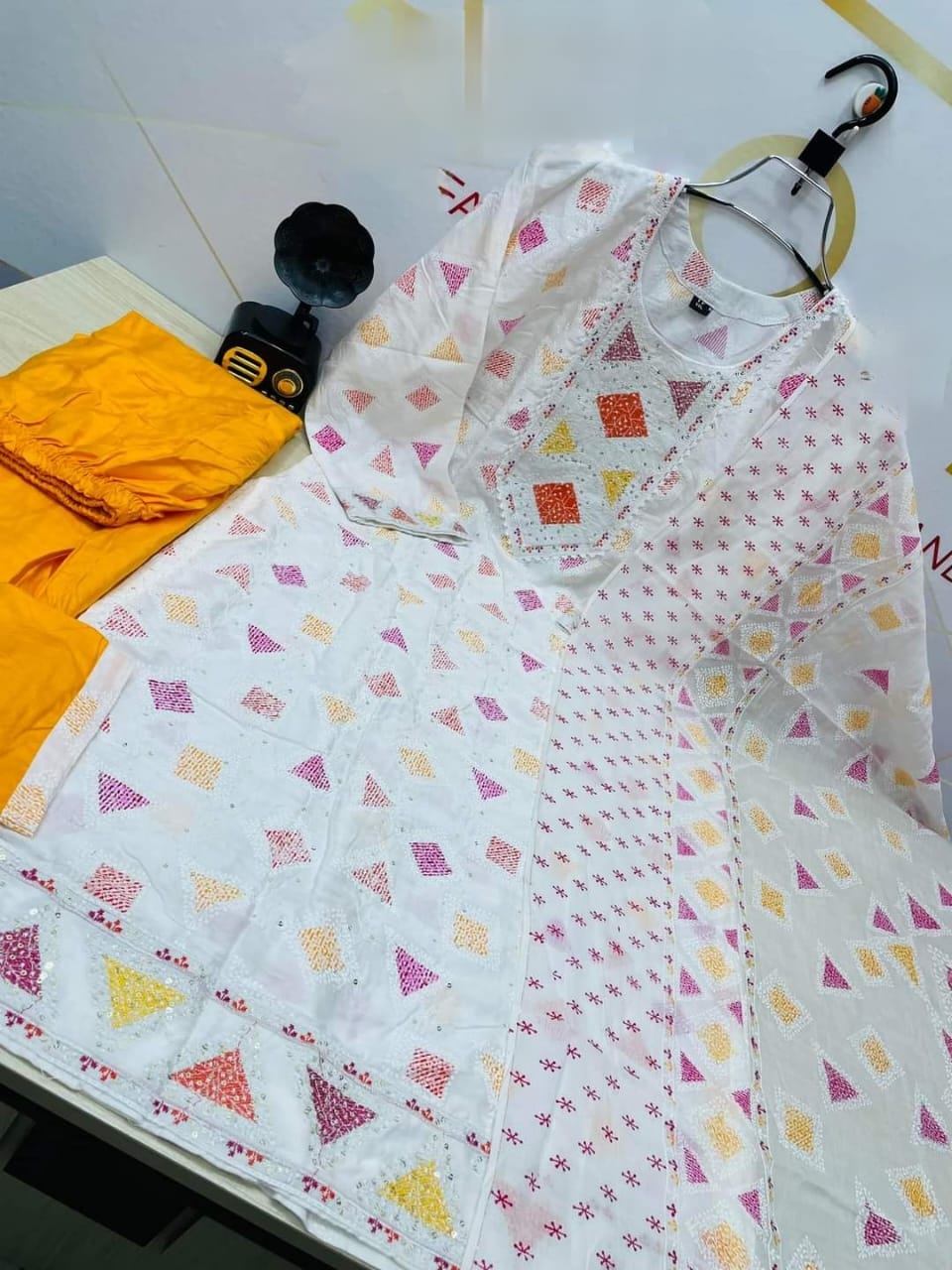 ফেব্রিক্স বডি:- এসি কটন। ফুল বডি ও গলা প্যানেলে সিকুইস কাজ করা 100%কোয়ালিটি।