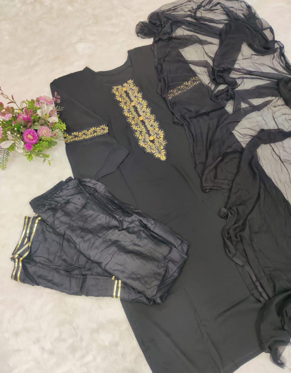 নিউ কালেকশন রেডিমেড থ্রী-পিস এম্বডারি কাজ জামা- ডাইমন্ড জরজে সেলোয়ার- ভি আইপি লিলেন(প্লাজু) ওড়না- পিউর শিফন