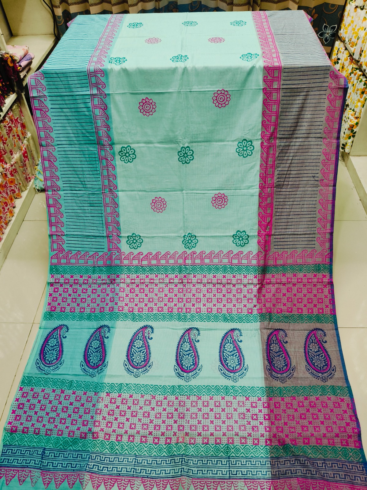 হাফ সিল্ক শাড়িতে ব্লক প্রিন্ট ও ডলারের কাজ করা