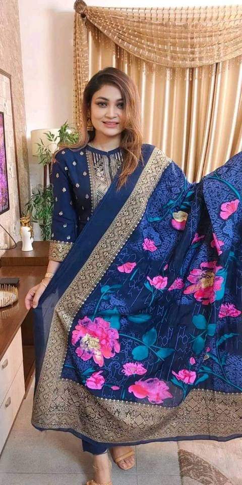 মদিনা ভয়েল ওড়না ও সেলোয়ার। আফসান ও রংয়ের স্ক্রিন প্রিন্ট করা।