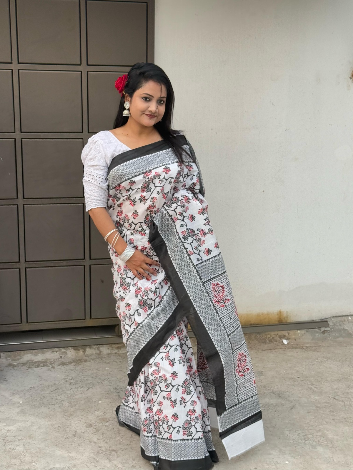 শাড়ির ডিটেইলসঃ প্রিমিয়াম হাফসিল্ক শাড়ি স্কিন প্রিন্টের কাজ করা ব্লাউজ পিস থাকবে না।